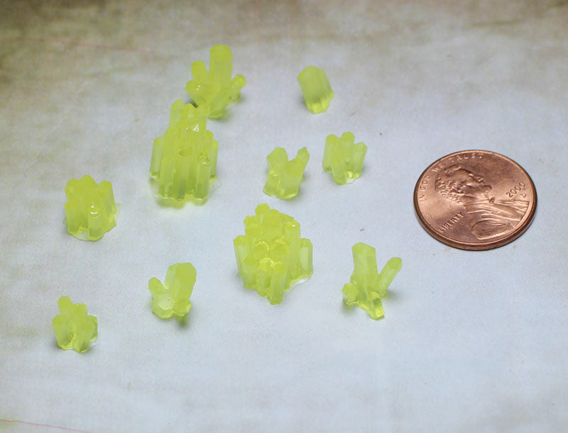 A set of ten randomly selected translucent yellow resin crystals, with a footprint measuring 2mm to 10mm across.