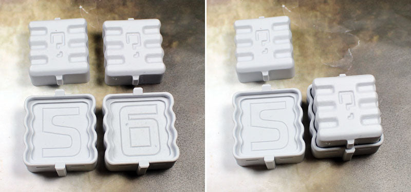 A set of two two part "mystery objective" markers made up of a box containing the numbers 5 & 6, and a lid to hide them for random reveals during the game, used to expand on the 1, 2, 2, 3, 3, 4 objective set. This product is sold unpainted and should be washed in cool, soapy water prior to painting. Master sculpt by Eric Hedman