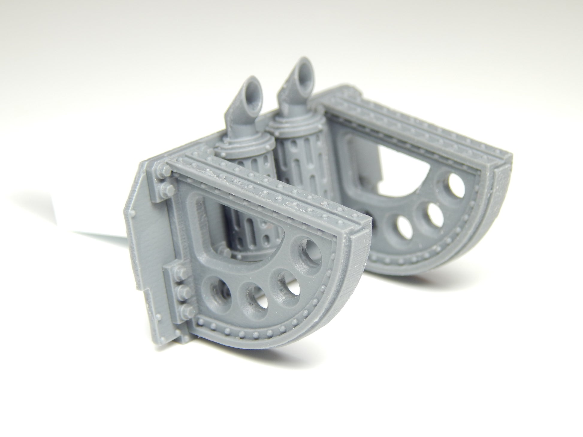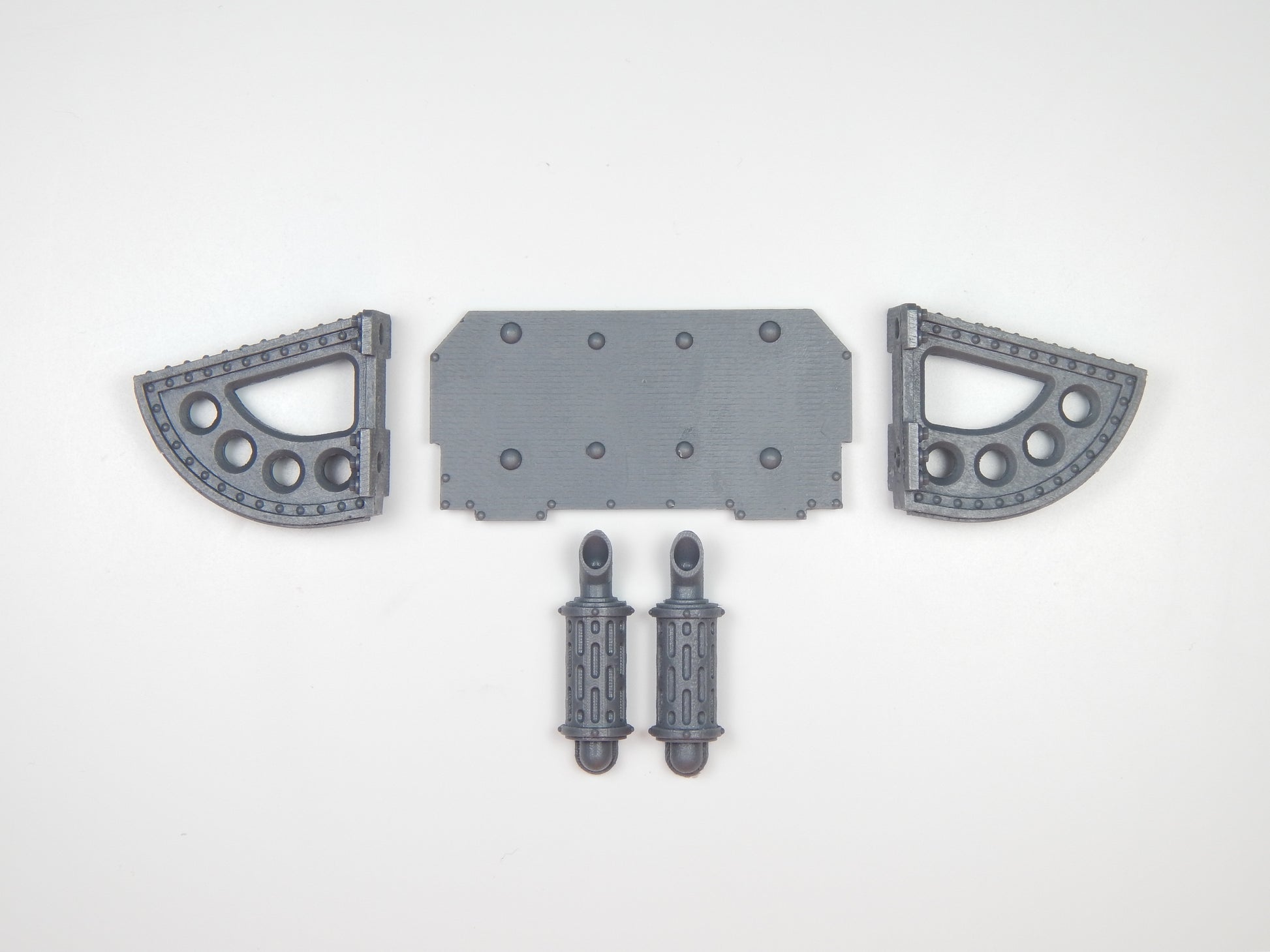 This set consists of a rear panel, two trench rails, and two (2) exhaust pipes. When assembled the Rear Engine Plate is 1.9 inches wide (48mm), 0.3 inches deep (8mm), and 1.1 inches tall (28mm).