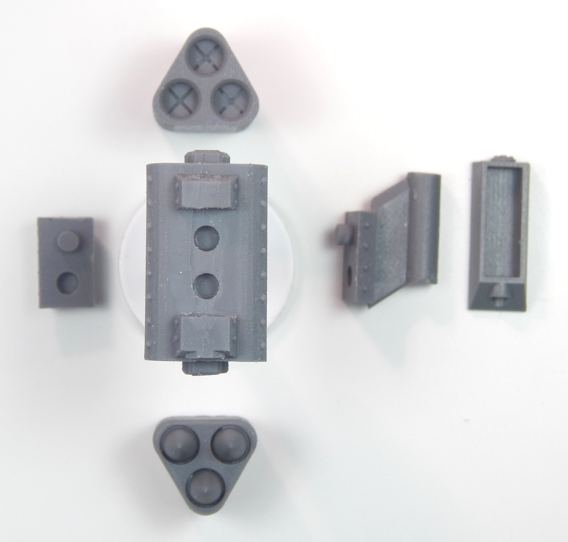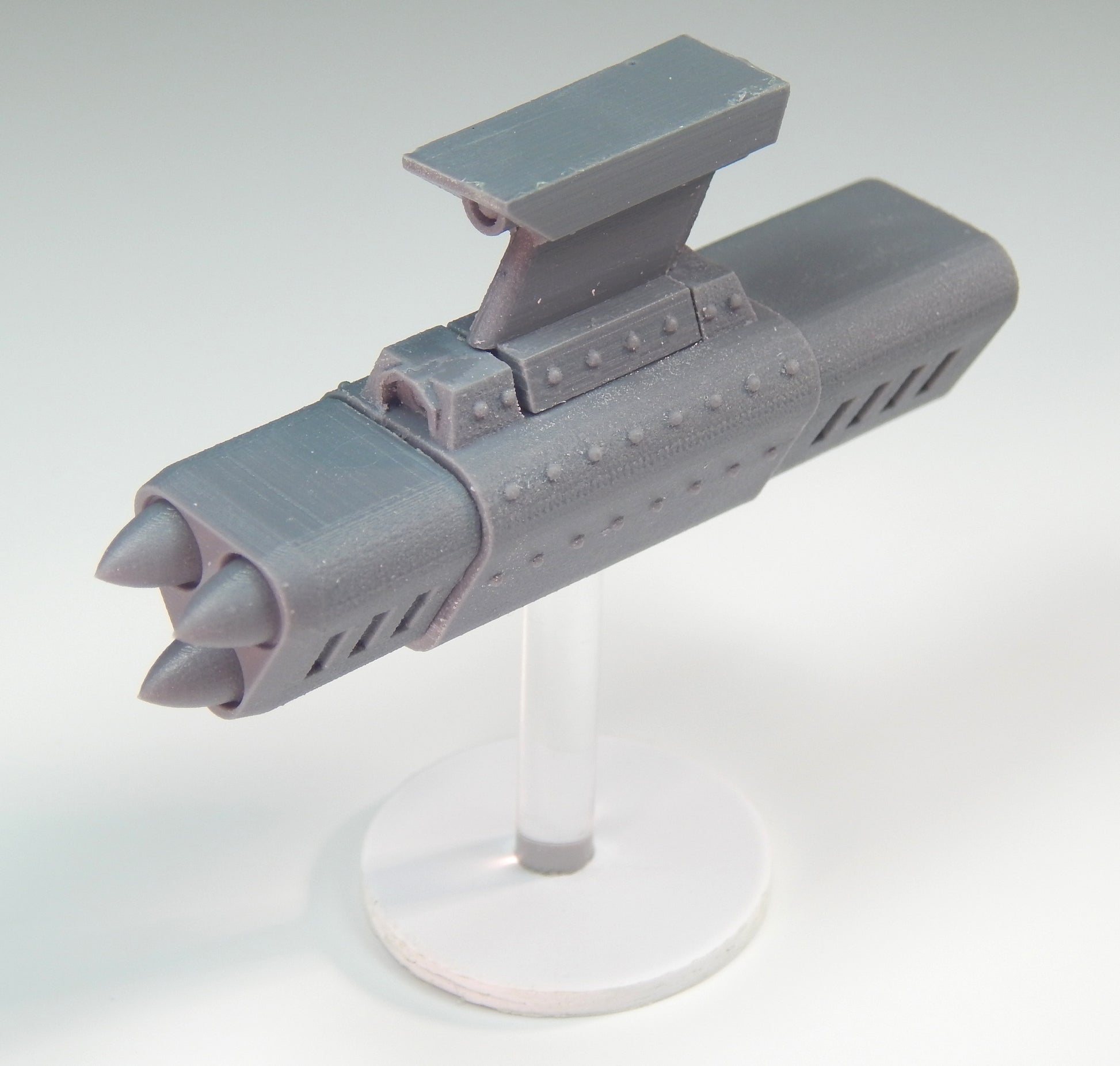 The Rocket Pods A is a multi-piece set to build two sets of rocket pods. The main pod is 2.3 inches (58mm) long, 0.5 inches (12mm) wide and 0.5 inches (12mm) tall. The top mount can swivel up to 20 degrees side to side making it easy to mount on downswept wings. Each rocket pod is also pre-drilled for 1/8 inch diameter by 1/16 inch thick magnet. Designed by Kentrin Military Industries.