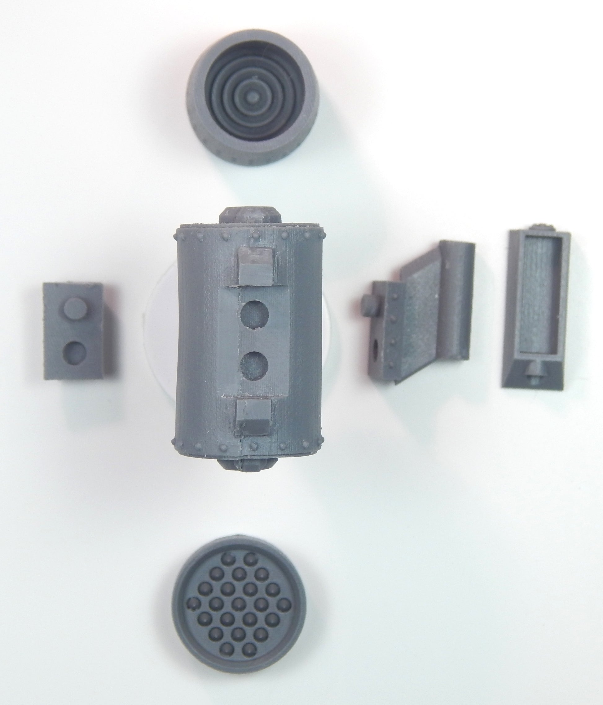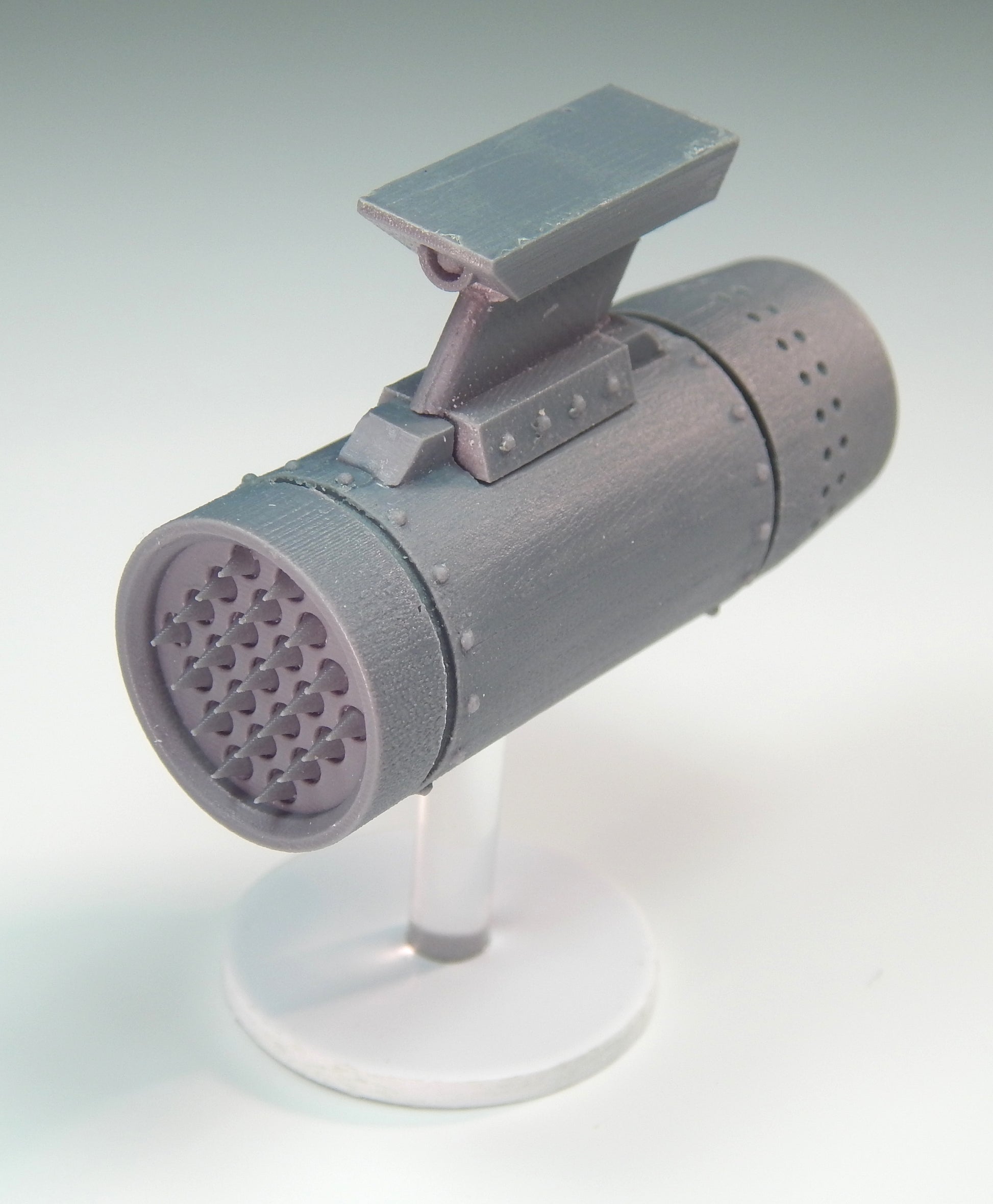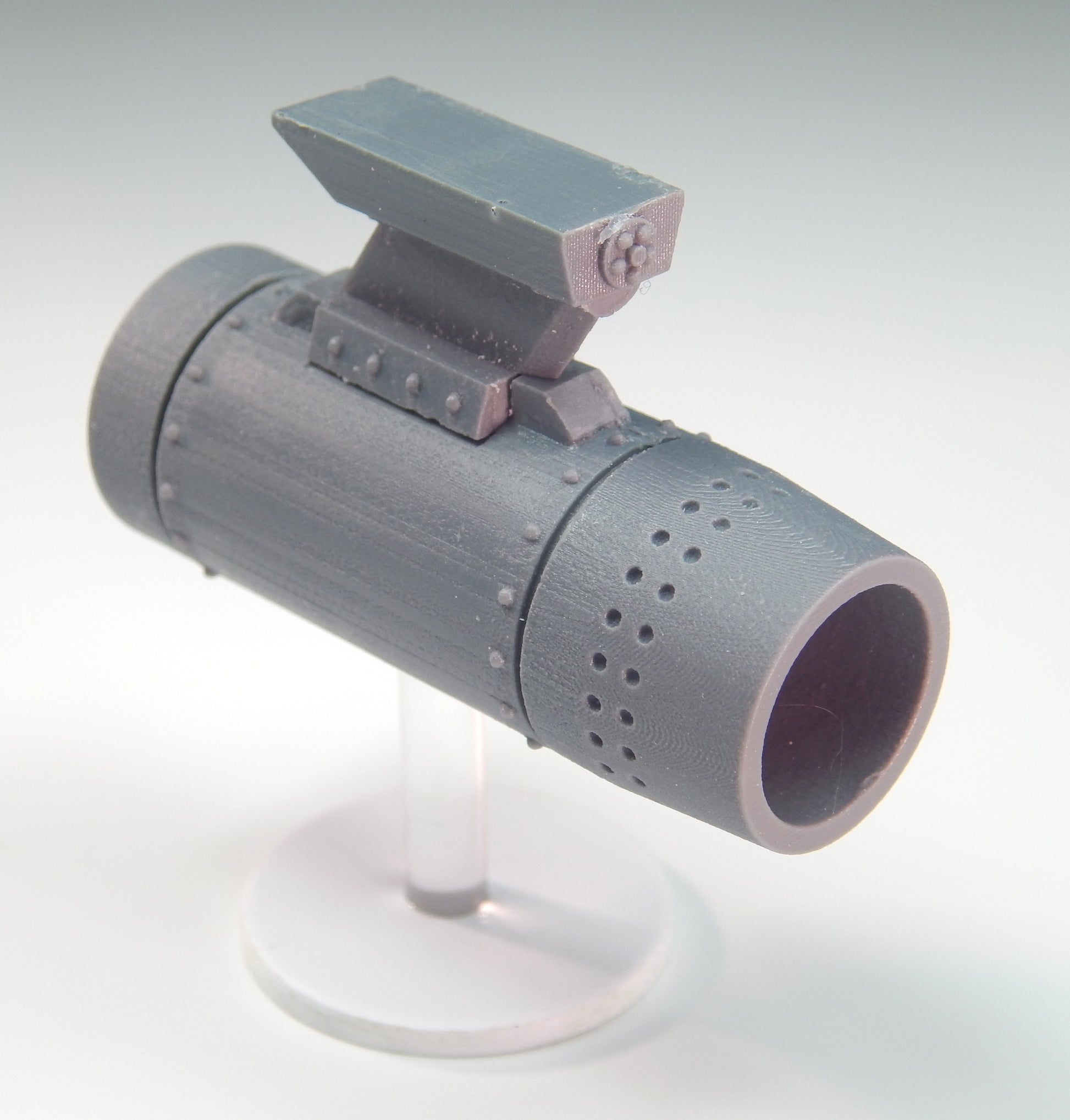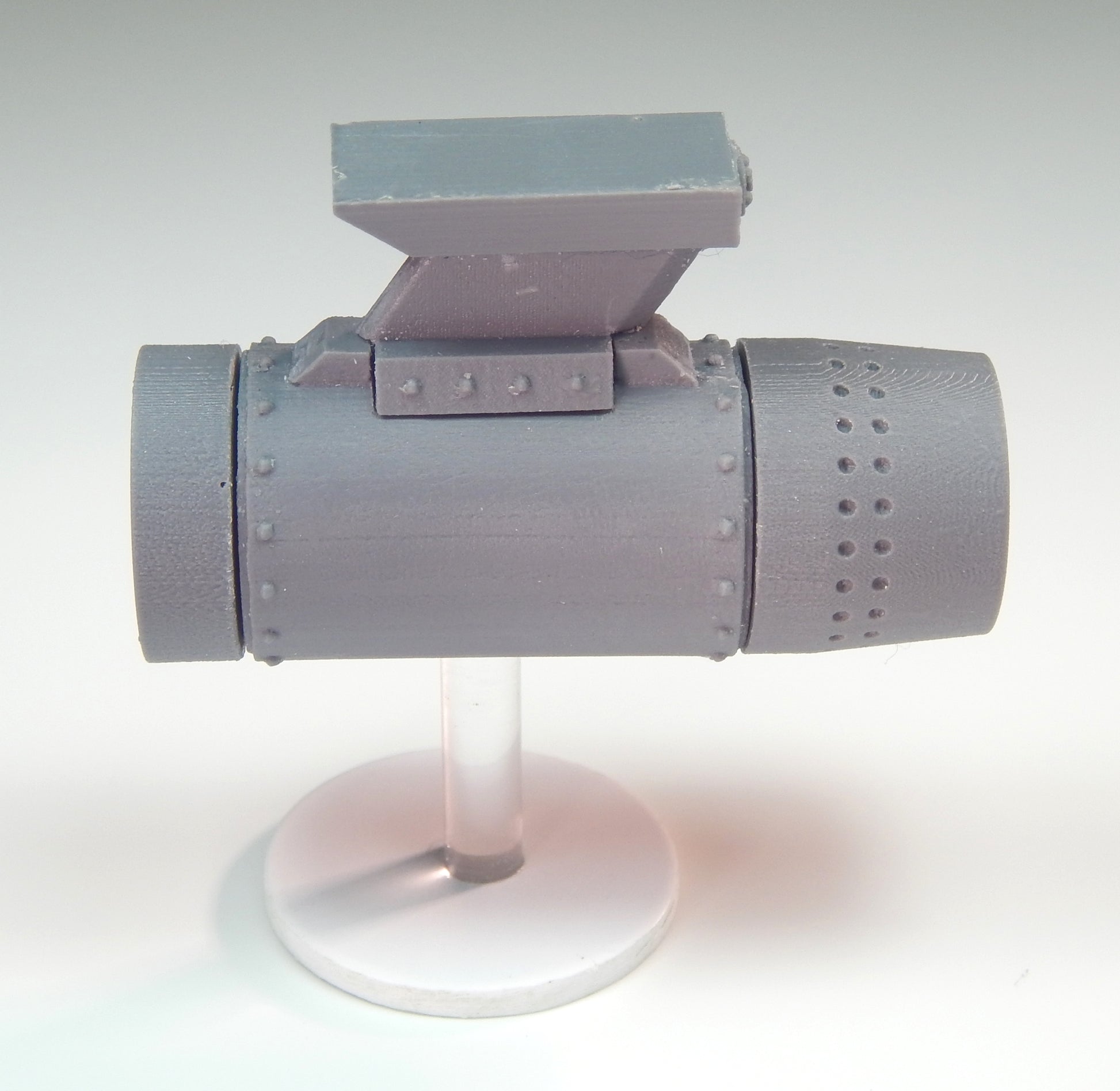 The Rocket Pods B is a multi-piece set to build two sets of rocket pods. The main pod is 1.8 inches (45mm) long and 0.7 inches (18mm) in diameter. The top mount can swivel up to 20 degrees side to side making it easy to mount on downswept wings. Each rocket pod is also pre-drilled for 1/8 inch diameter by 1/16 inch thick magnet. Designed by Kentrin Military Industries.