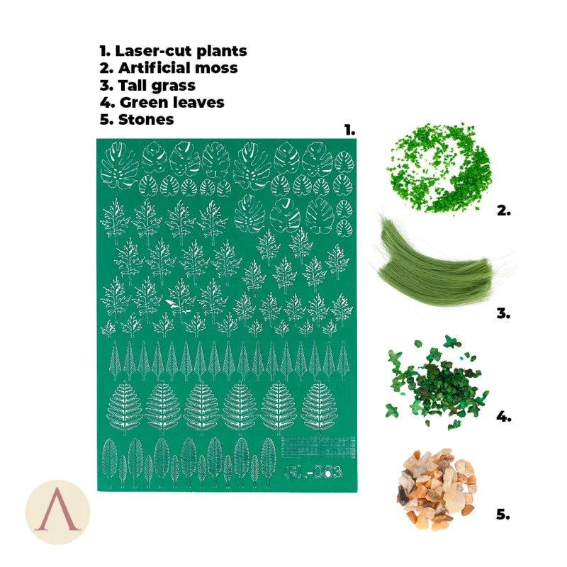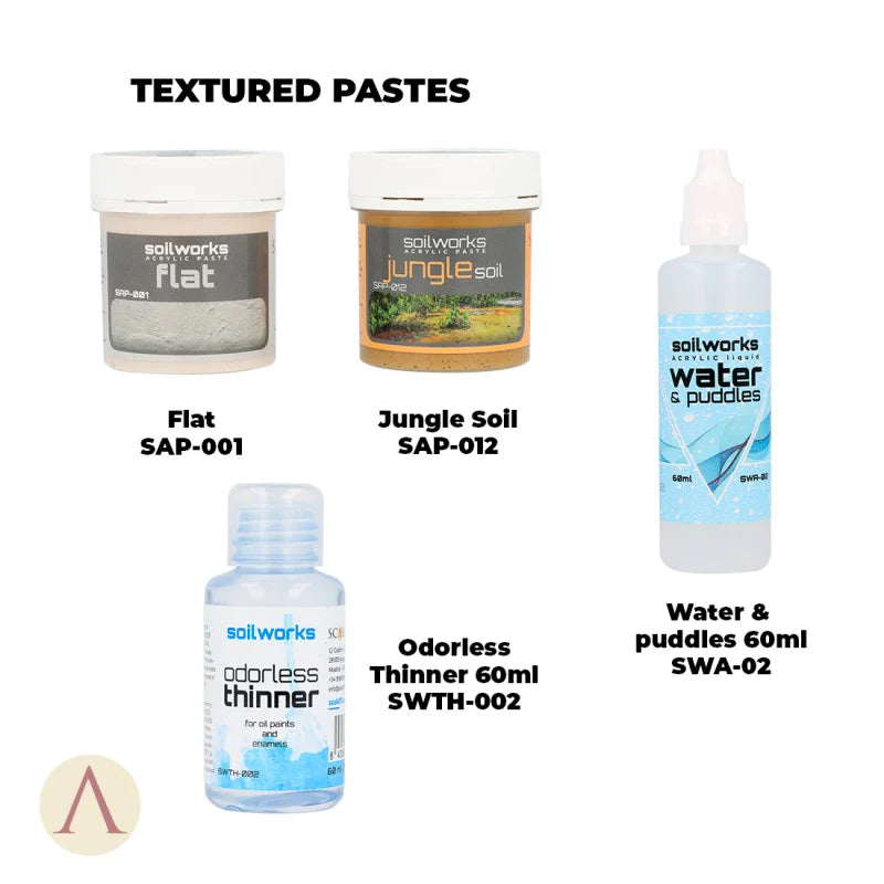 Create elaborate bases for your Games Workshop Warhammer 40K (Tyranids, Catachan, Astra Militarum), Age of Sigmar (Seraphon), Lord of the Rings and Middle Earth strategy game, and D&D models. Set includes an instruction guide, 3 drop bottle paints, 2 paint tubes, 2 pigements, 2 textured pastes, & 7 auxiliary products.