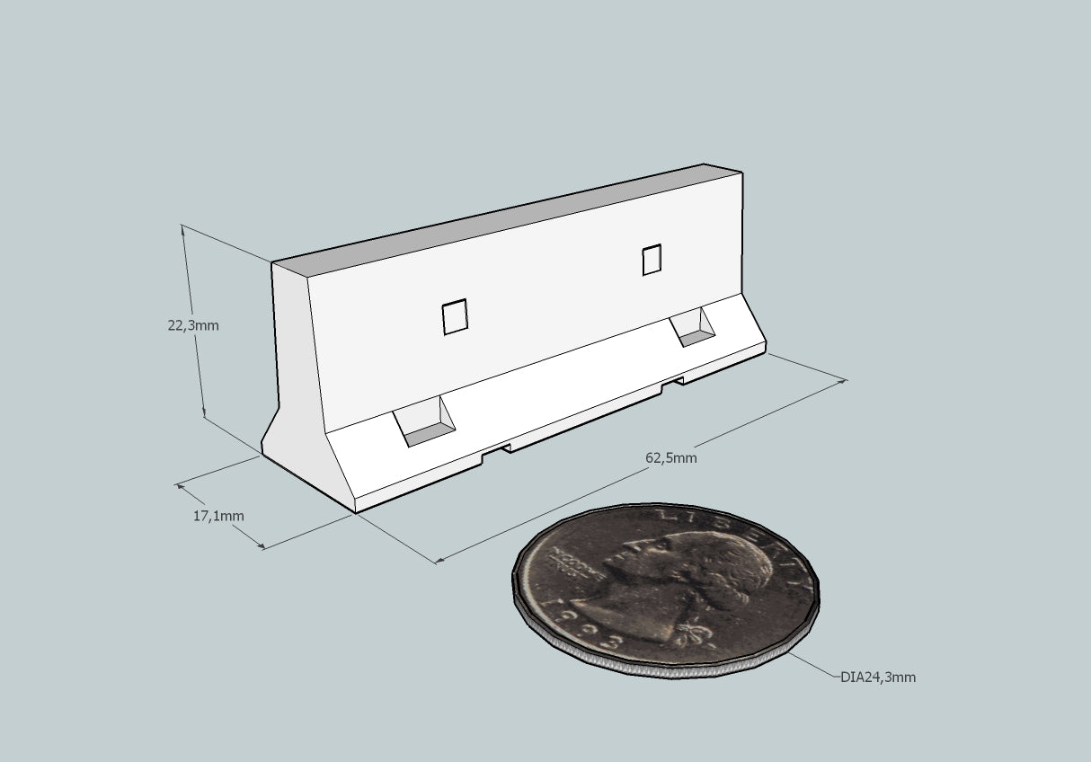 A set of 5 pressure cast resin Jersey Barriers (aka K-Rails) accurately detailed in 1:48 scale and perfect for 28mm wargamers and O-Scale train hobbyists alike.